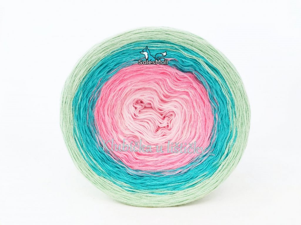 Klubíčko je tzv. třínitka, je tedy smotáno ze 3 vláken. Tyto nitky nejsou pevně spojené, ale jsou smotány volně v klubíčku. Při práci to ale není nijak znát, dělá se s nimi velmi pohodlně. Výrobky budou lehké a vzdušné. Z jednoho klubíčka si můžete vyrobit opravdu velký šátek, šaty pro holky či sukně pro dámy. Lze jej použít také na letní deky do kočárku apod. Výrobky doporučujeme prát v ruce do 40°C, sušit rozložené, nebělit, nežehlit a nedávat do sušičky.