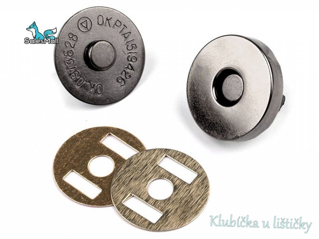 Populární magnetické zapínání má široké možnosti využití. Často se tento typ, zvaný magnetický buldok, používá u společenských kabelek s dekorativní přední klopou. Upevnění je snadné. Jedna sada se skládá ze 4 částí - 2 protikusů a 2 podložek.